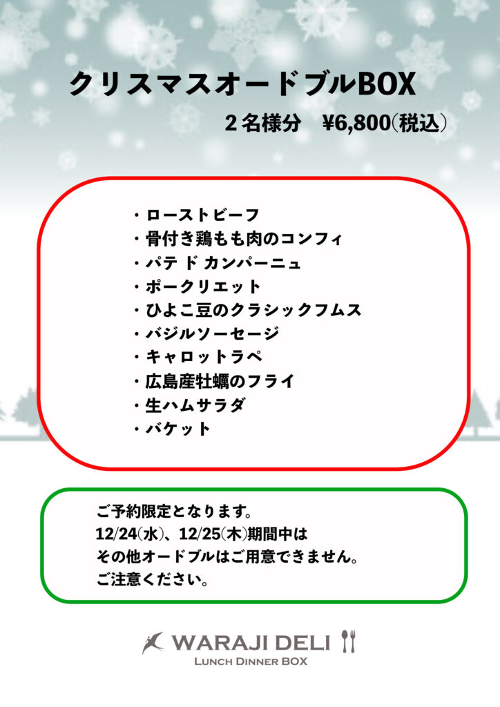 2025年11月24日 お知らせ クリスマスオードブルBOXのご予約承ります 今年もクリスマスオードブルBOXのご予約を承ります。ご予約はお早めに! クリスマスオードブルBOX2名様分 6,800円(税込)